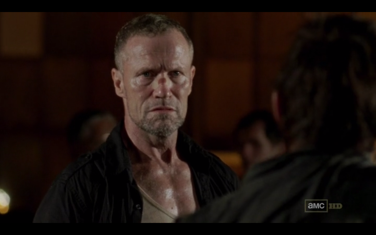 Outside Andrea walks up to the Governor saying she heard shots and wants to go check it out. He tells her not to worry about it, it's probably just biters getting in the side gate and he will handle it. They overhear a girl yelling for help. As they run up to her it appears she is helping the guy that Daryl knocked out earlier. The Governor wants to know how many people, and he gets told it was at least 6-7 (counting is hard in the zombiepocalypse). People are gathering around and freaking out. The Governor tells them the best thing to do while the sort it out is everyone go to their home, lock doors and shut off lights. As people disperse to follow his orders a few more of his little militant peons show up and ask whats going on. He tells them the town is under attack, and they should shoot to kill, not capture.