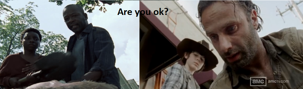 So we start off with Michonne driving Rick and Carl out on a run. We don't know exactly where they are going, but it's more fun to just drive random places during a zombie uprising so let's just run with it.